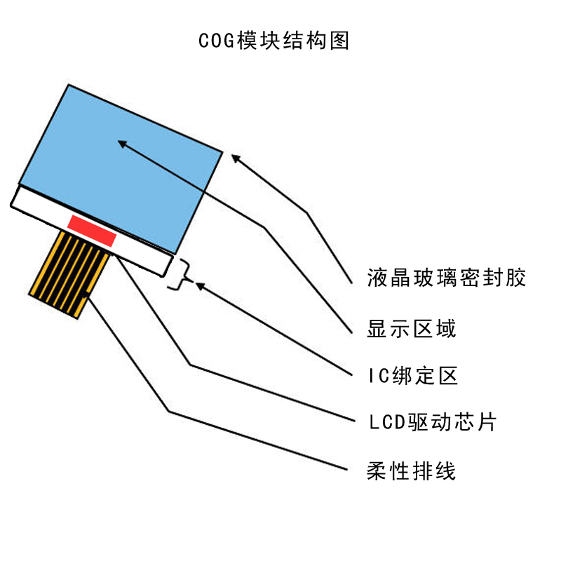 对于COG显示模块的组成,需要三个组件,如图所示:液晶面板、驱动IC和ACF(连接介质)。